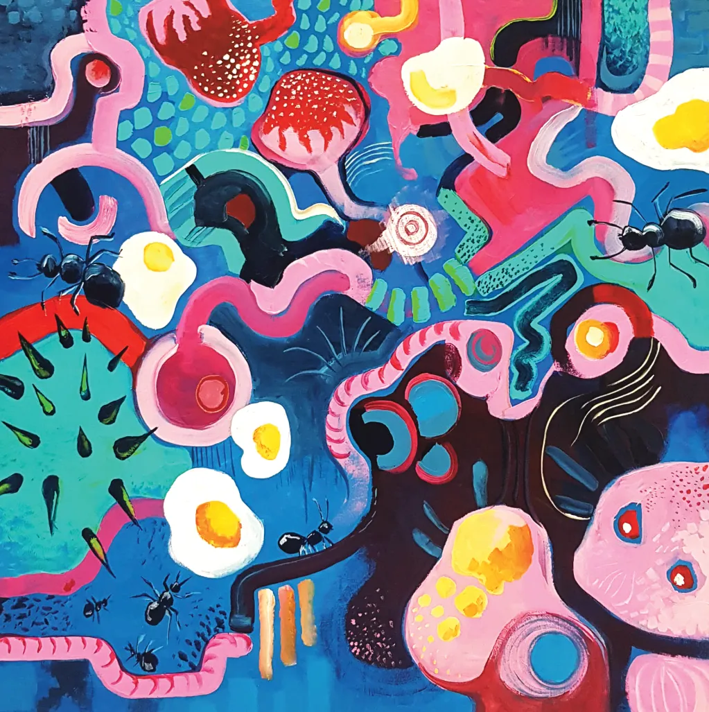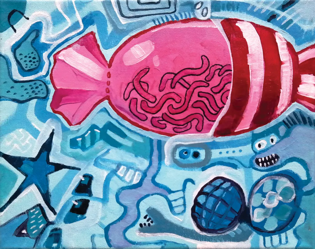do otaczającego mnie świata. Jestem artystą, głównie rysuję, a w wolnym czasie lubię tworzyć stroje swoich ulubionych złoczyńców z kreskówek i się za nich przebierać. Niedługo też skończę studiować Grafikę na ASP w Warszawie. Ta wystawa w pewnym sensie pokazuje, co mam w środku, czyli bałagan. Kolorowy bałagan, gonitwę myśli, która towarzyszy mi chyba od zawsze.Katarzyna Kubasik