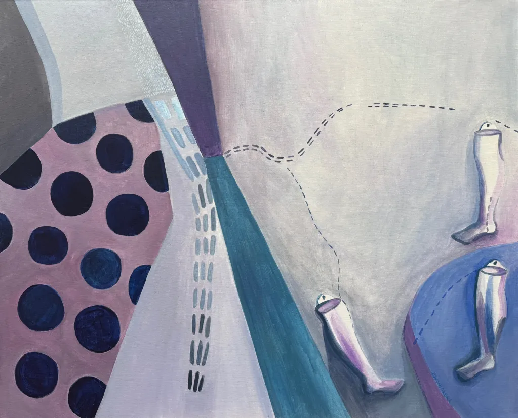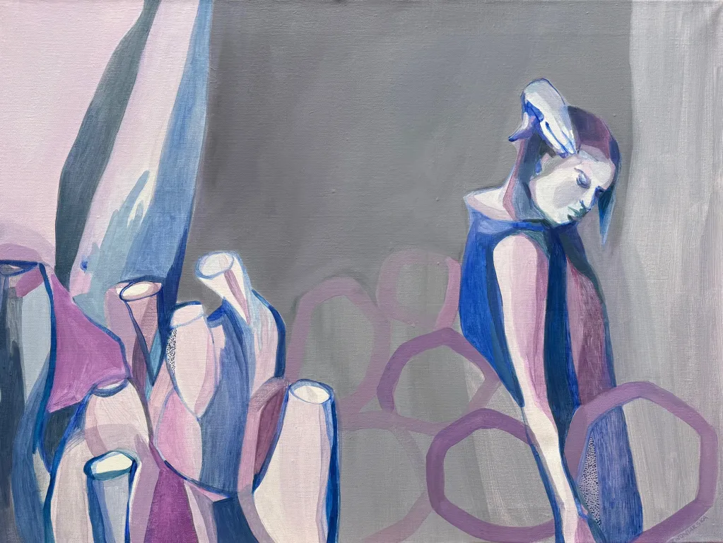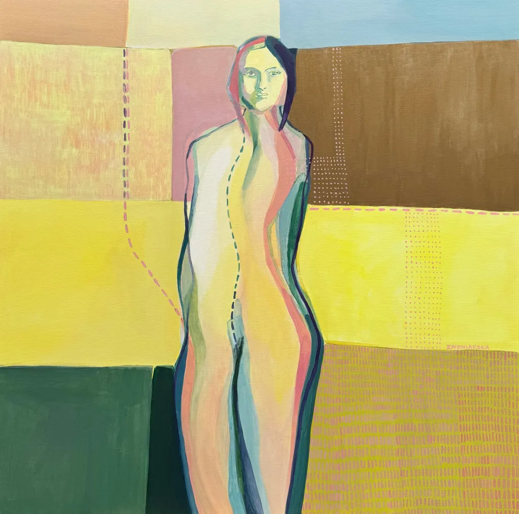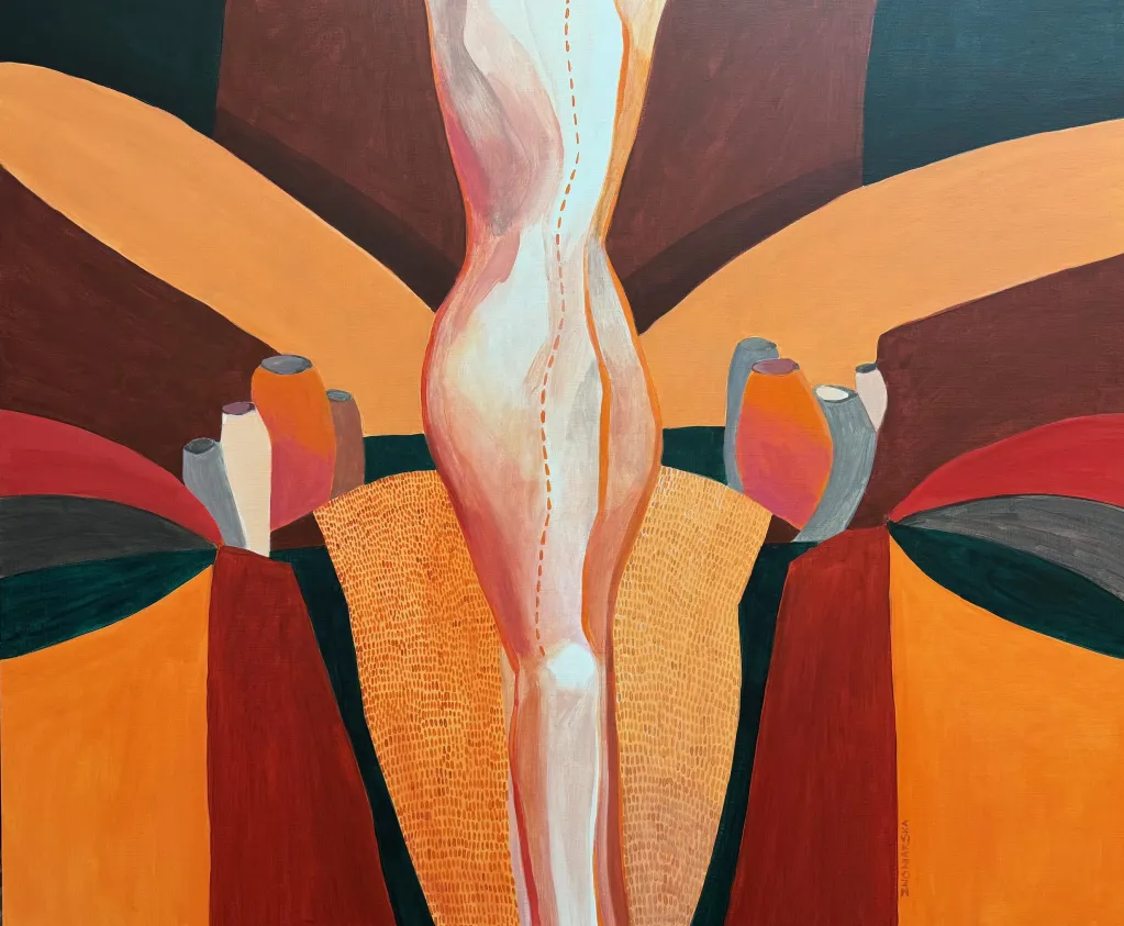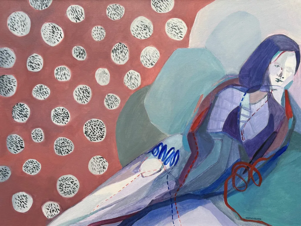 Najnowsze prace odchodzą już od tematu choroby nowotworowej, ale nadal są opowieścią o Karolinie. Nie da się tych prac oderwać od niej, one są o niej, one są nią. Karolina świadomie snuje wątki autobiograficzne nadając pracom bardzo ciekawe tytuły. Mocno powiązane z tematem szycia, tylko pozornie mówią o tej czynności; w rzeczywistości to gra słów, która odnosi się do operacji nogi - których w dzieciństwie przeszła wiele - i wszystkiego co się z tym doświadczeniem wiąże. Odczytuję te obrazy jako dwuwymiarową intymną opowieść, w której Karolina świetnie pracuje kolorem, wie po co go używa. Intuicja, lata pracy z barwą prowadzą ją. Buduje swoje obrazy poprzez subtelne zaznaczenie części ciała, które łączy z siatką znaków, symboli, blizn czy abstrakcyjnych powiązań i … nagle w 2024 roku rodzi się w Karolinie potrzeba wyjścia z tej płaskiej barwnej materii i sięga po formy przestrzenne. Tworzy, lepi wielowarstwowe formy rzeźbiarskie, które sama nazywa organami. Mam wrażenie, że w obrazach bardziej pokazuje nam powłokę zewnętrzną, a w ceramice wchodzimy do jej środka. Chropowate, podziurawione formy - pokryte za pomocą techniki raku niedoskonałym poszkliwieniem - pokazują ludzką ułomność.