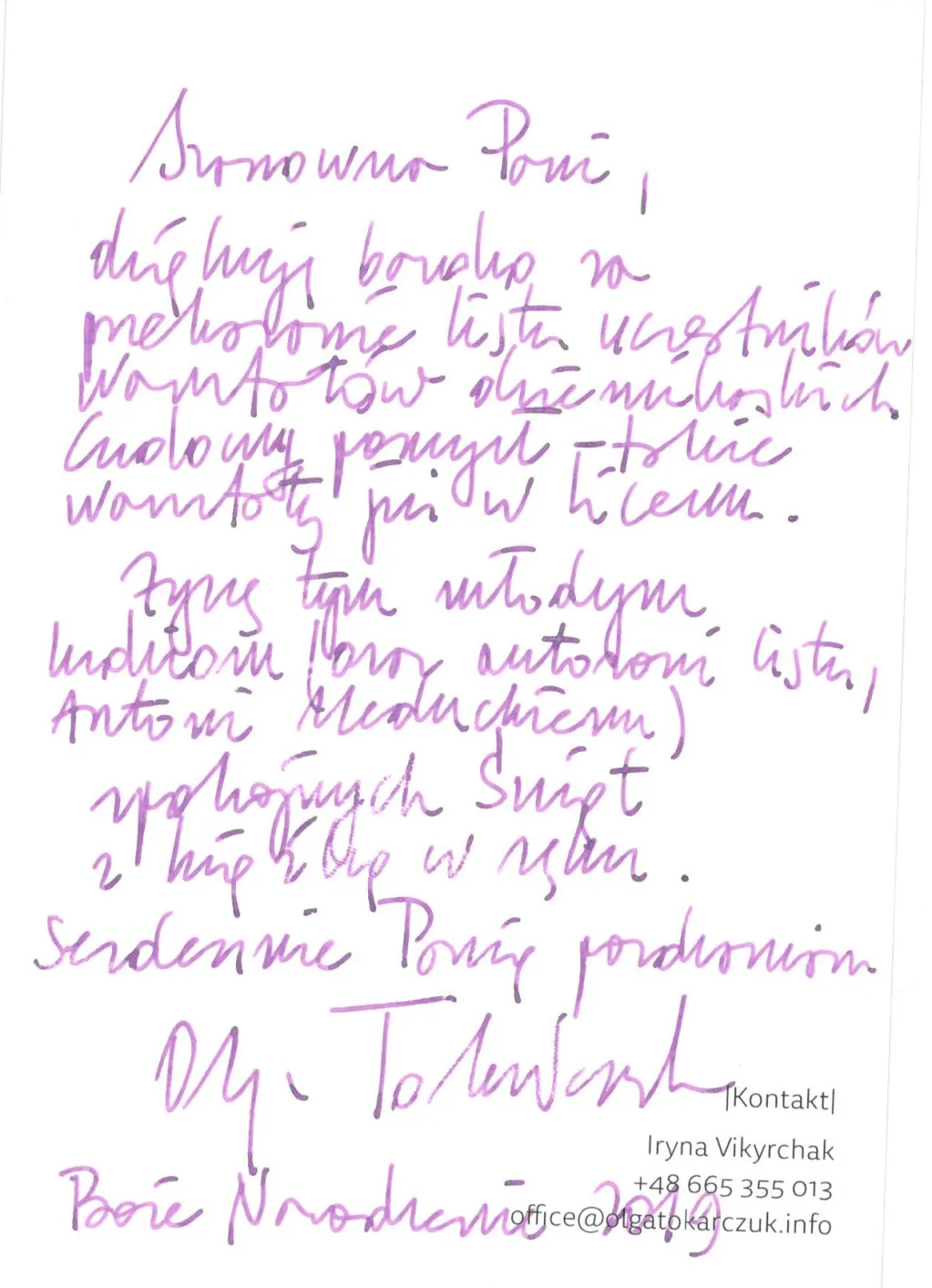 List gratulacyjny dla Olgi Tokarczuk i podziękowania dla uczestników od Noblistki