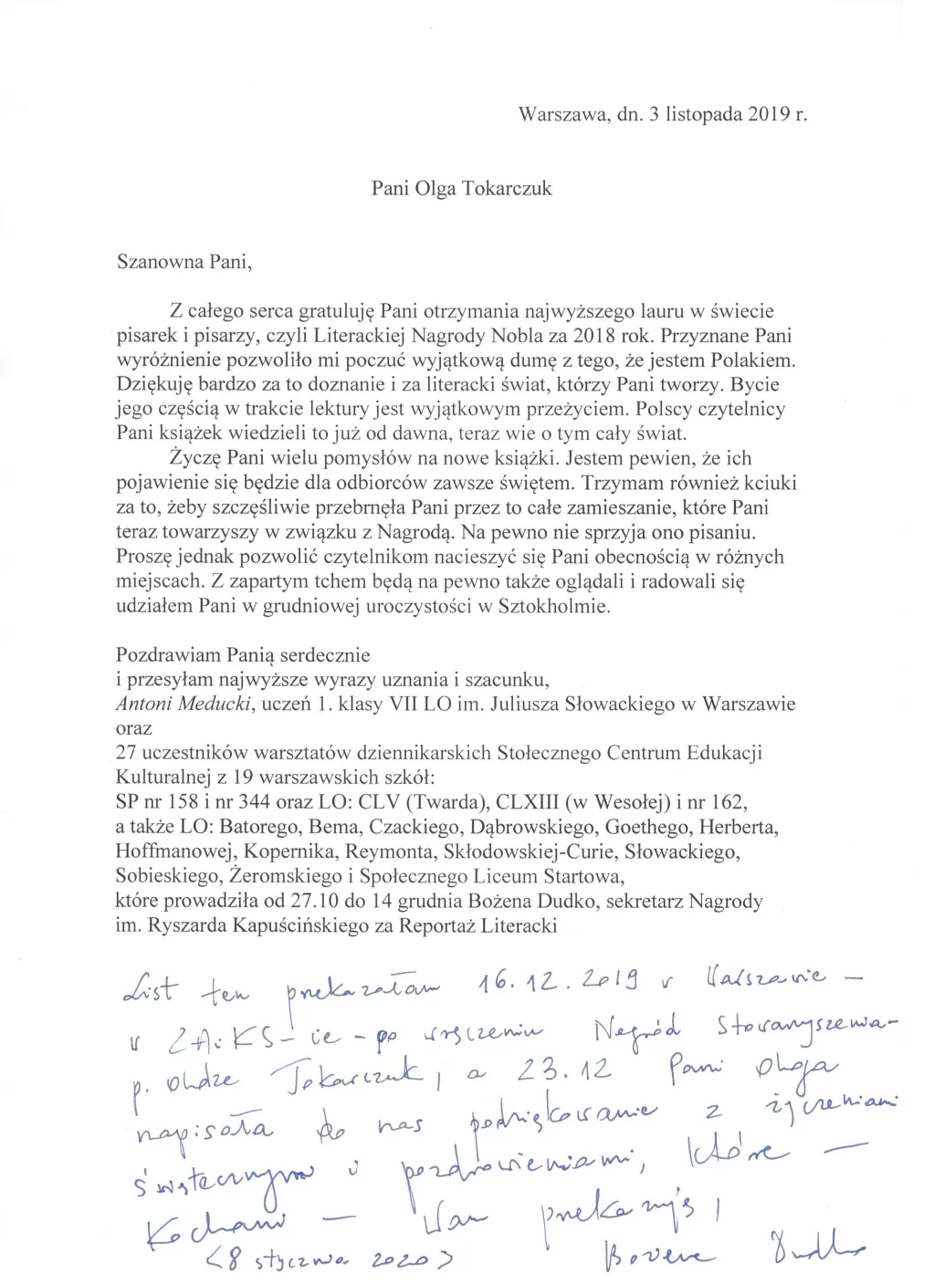 Pierwszą zadaną pracą na inauguracyjnych warsztatach 26.10.2019 było napisanie listu gratulacyjnego dla Olgi Tokarczuk, naszej Noblistki. Prowadząca wyróżniła pięć listów, a jeden z nich – napisany przez Antka Meduckiego – postanowiła przekazać p. Oldze Tokarczuk przy najbliższej okazji, która nadarzyła się 16 grudnia w Warszawie w Stowarzyszeniu Autorów ZAiKS. 8 stycznia Bożena Dudko otrzymała pocztą wspaniałą niespodziankę: podziękowanie za list gratulacyjny od naszej Noblistki, które napisała jeszcze przed świętami. To ogromne wyróżnienie, że Olga Tokarczuk w ogromie swoich obowiązków znalazła czas, by warszawskim uczniom odpisać. Jesteśmy zachwyceni!